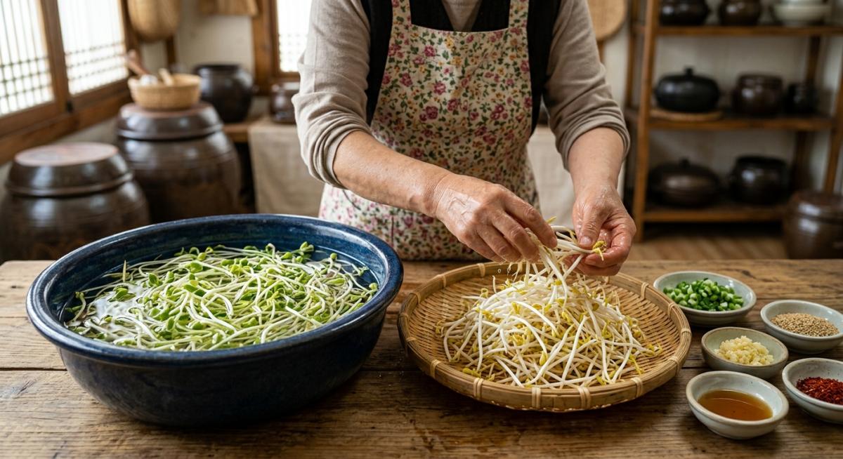 숙주무침은 조리 과정이 간단하지만, 재료 상태가 매우 중요합니다. 숙주를 고를 때는 통통하고 탄력 있는 줄기를 선택하고, 머리 부분이 검게 변했거나 비린내가 나는 것은 피하는 것이 좋습니다. 집에 가져온 뒤에는 흐르는 물에 여러 번 씻어 껍질과 불순물을 제거해야 합니다. 이때 줄기가 부러지지 않도록 조심스럽게 씻는 것이 중요합니다.